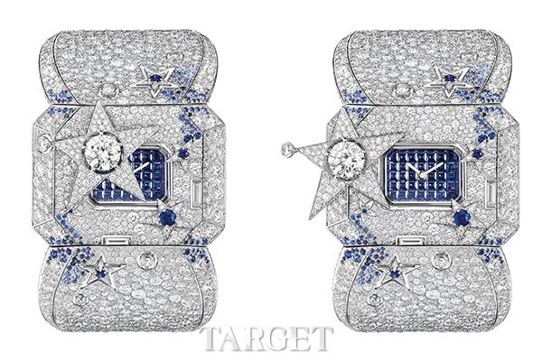 致献彗星之作。设计灵感源于香奈儿女士为1932年”Bijoux de Diamants”钻石珠宝系列所创作的彗星主题珠宝作品。铐式手镯设计的表带镶嵌钻石与蓝宝石,勾勒出星光闪烁的夜空。纤纤玉指掠过璀璨群星,在一颗中央镶嵌蓝宝石的精致星星前停驻。秘密揭开,一块铺镶长阶梯形蓝宝石的表盘悄然显现。
